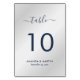 Elegant navy blue and silver wedding table number card featuring a modern script font. Matching items available.