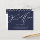 Navy blue new home new address announcement featuring a modern script font with a coordinating plaid back for an extra touch.