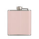 This flask features personalized bridesmaid's name in white modern script font style with title and wedding date in white modern sans serif font style on blush pink background.