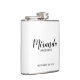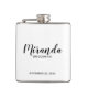 This flask features personalized bridesmaid's name in black modern script font style with title and wedding date in black modern sans serif font style on white background.