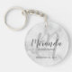 This keychain features personalized bridesmaid's name in grey modern script font style and monogram in light grey modern script font style as background with title and wedding date in grey modern sans serif font style on white marble background.
