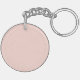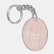 This keychain features personalized bridesmaid's name in white modern script font style and monogram in blush pink modern script font style as background with title and wedding date in white modern sans serif font style on blush pink background.