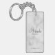 This keychain features personalized bridesmaid's name in grey modern script font style with title and wedding date in grey modern sans serif font style on white marble background.