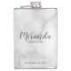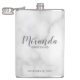 This flask features personalized bridesmaid's name in grey modern script font style with title and wedding date in grey modern sans serif font style on white marble background.