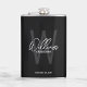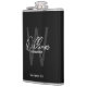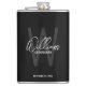 This design features personalized groomsman's name in white modern handwriting script font style and monogram in light grey modern sans serif font style as background, with wedding details in white modern sans serif font style, on black background.