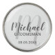 This divot tool features personalized groomsmen's name in grey modern script font style and monogram in light grey modern script font style as background with title and wedding date in grey modern sans serif font style on white background.