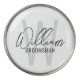 This design features personalized name in grey modern handwriting script font style and monogram in light grey modern sans serif font style as background, with title in grey modern sans serif font style, on white background.