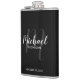 This flask features personalized groomsmen's name in white modern script font style and monogram in light grey modern script font style as background with title and wedding date in white modern sans serif font style on black background.
