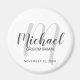 This magnet features personalized groomsmen's name in grey modern script font style and monogram in light grey modern script font style as background with title and wedding date in grey modern sans serif font style on white background.
