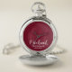 This design features personalized groomsmen's name in white modern script font style and monogram in light burgundy red modern script font style as background with title and wedding date in white modern sans serif font style on burgundy red background.