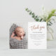 This modern photo thank you note features rose gold handwritten script thank you, personal message and a vertical photo on the front. The back includes a second baby photo that is a full bleed horizontal photo.