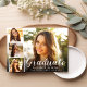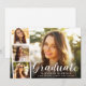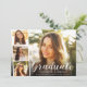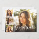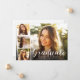 Modern script photo overlay graduation announcement flat card. The graduate's photo fills the front of the card, overlayed with a strip of three smaller square photos, "Graduate" in a stylish white script, and their name, school and class year in simple white typography.