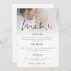 Printable Digital Dwnload or Printed Modern Script Photo Wedding Menu. An elegant design with your photo to the top edge behind a graduated tint layer with the text partially overlaid on top of yorur image at the bottom. The main header is in a stylish set script and the rest of the text you can easily personalise.