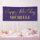 Elegant purple and gold "Happy birthday" party banner customized with the name of the guest of honor. The background color on this banner is completely customizable, so design on with your party colors today.