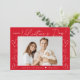 Modern Valentine's day card featuring "Happy Valentine's Day" in a trendy white script with hand-drawn hearts along the sides of the card on a red background. Your horizontal photo is displayed near the middle of the design. Personalize the red Valentine's Day card by adding your name and the year in white lettering. The card reverses to display a pattern of red and white hearts.
