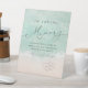 Beautiful turquoise abstract watercolor sparkling ocean wave and hearts in the sand beach background, toped with stylish script and elegant serif font, modern and simple. Great in loving memory sign for nautical bridal shower, beach wedding, birthday, graduation party, retirement party, funeral, etc.