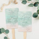 Beautiful turquoise abstract watercolor sparkling ocean wave and hearts in the sand beach background, toped with stylish script and elegant serif font, modern and simple. Great wedding programs for nautical beach wedding, tropical destination wedding, coastal ocean themed wedding in summer.