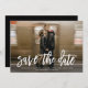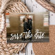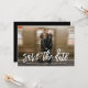 This modern wedding save the date announcement features a full-bleed horizontal photo and a modern script "Save the Date" in white. The back of the card is black. ALL colors are customizable - backer color, text color, even the script color! Just click "edit using design tool" in the dropdown menu.