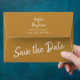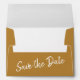 Modern Script Save the Date Return Address Wedding envelope. The text is in modern white script - personalize the envelope with the bride`s and groom`s names and the address. Change or erase the Save the date text. The envelope is in a golden color, but you can choose any other color. Great for your wedding, engagement and save the date mailing.