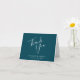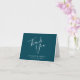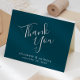 This elegant modern minimalist wedding thank you card features stylish handwriting script in white on a teal blue background. Add the couple's names and wedding date in sans serif font.