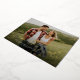 With a single horizontal photo and a modern script written "save the date" in foil, this card is the perfect way to announce your engagement and upcoming wedding to friends and family. The text is bold and modern but still sophisticated. The customizable text on the front has room for names, date, location and other information like a wedding website. The back is a neutral gray and white striped pattern. The color is editable by clicking "Customize."