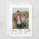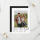 With a single vertical photo and a modern script written "save the date," this card is the perfect way to announce your engagement and upcoming wedding to friends and family. The black text is bold and modern but still sophisticated. The customizable text on the front has room for names, date, location and other information like a wedding website. The back is a black and white striped pattern. The black color is editable by clicking "Customize."