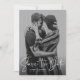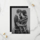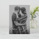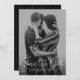 With a single vertical photo and a modern script written "save the date," this card is the perfect way to announce your engagement and upcoming wedding to friends and family. The white text is bold and modern but still sophisticated. The customizable text on the front has room for names, date, location and other information like a wedding website. The back is a black and white striped pattern. The black color is editable by clicking "Customize."