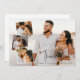 Say thank you to your wedding guests with a photo collage where you can feature four of your own lovely wedding photos. One large photo covers the entire card. Choose a photo where you have plenty of negative space on the left side. The three other photos are square and smaller. Add your names and wedding date in a modern black font. Thank you is written in a charming hand-written script. On the back you can write by hand a personal thank you message on the faintly lined background.