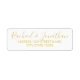Modern Script White and Gold Wedding Return Address Label featuring bride and groom's name in modern calligraphy font and address in modern sans serif font style.