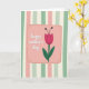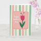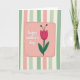 Designed with a soft, cheerful illustration, the card centers on a blush-pink panel with rounded corners that feels cozy and affectionate ❤️. A dashed brown outline around the panel resembles neat stitching, and tiny speckles scattered across it add a lightly textured look. In the middle of the pink area, the text “happy mother’s day” appears in white, flowing lettering that looks gentle and caring. To the right of the message, a stylized fuchsia flower stands tall on a deep green stem, with two wide leaves that angle outward like open arms. The petals are outlined in black, and two thin black filaments topped with dark dots rise from the bloom, giving it a sweet, friendly character 🌼. Behind everything, vertical stripes alternate sage green, ivory, and blush pink, creating a calm backdrop that feels like a quiet hug. The front design shows the pink panel centered against the striped background, with the flower positioned on the right side of the panel and the white lettering set squarely in the middle.