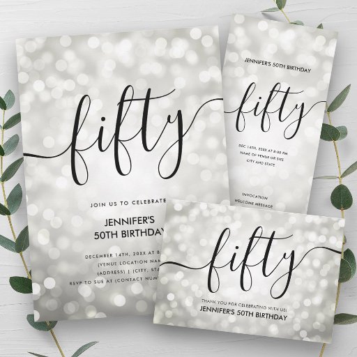 Elegant Glam Silver Glitter Lights 50th Birthday Script template featuring glitter lights and modern typography script.