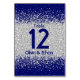 This modern table number card has a silver glitter effect on a deep royal blue background. You can change the font style and color and also add each table number individually by going to the customize menu. This is part of a wedding suite with a matching menu, place cards and other essentials.