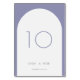 Simple minimalist wedding table number with a white arch over a purple background. Great for minimal purple weddings. Designed by Patricia Alvarez.