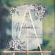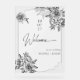 A classic black and white welcome sign perfect for any wedding-related event. Delicate hand-drawn peonies adorn the corners, adding a touch of floral elegance without the use of color. This modern, monochrome design creates an edgy yet timeless look that pairs effortlessly with any décor. A semi-transparent Art Deco–inspired frame highlights the text, ensuring it stands out beautifully on this transparent sign.