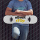 Modern, simple, bold typographic design of a saying "Never Stop" in yellow and black colors. Cool, urban, trendy and playful graphic art