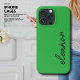 This modern, simple green iPhone case features customisable text in a stylish handwritten style in black.