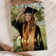 This graduation announcement features a large, full front photo with modern calligraphy overlay and graduation party details on the back. The back elements can be removed by clicking the button to edit further.