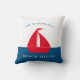 Stunning nautical red white and blue throw pillow featuring a red boat on a white and blue colorblock background , with a two text templates where you can add your family name and boat house , summer home or even cottage , very easy to personalize and make it your own.