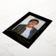 A simple, modern and elegant design for a graduation announcement with black background. The card has a space for one photo of the graduate and shows the word GRADUATE at the bottom of the photo in real gold foil. Below the photo is the name of the graduate and on the right side of the picture is the school name and class of 20XX. Black and gold make for an elegant combination.