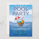 Simple Pool Party Invitation. Design features water and floating coconut. Click customize further to edit this template.