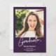 A modern, simple white on purple graduate script brush with 2 photos graduation announcement. Add your message at the back.
