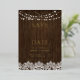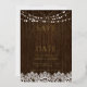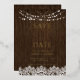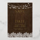 Modern rustic save the date featuring faux barnwood texture, and golg foil modern hand written calligraphy, in an elegant, simple design, featuring twinkle lights and lace. Copyright Anastasia Surridge Designs, all rights reserved.