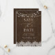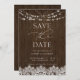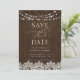 Modern rustic save the date featuring faux barnwood texture, and modern hand written calligraphy, in an elegant, simple design, featuring twinkle lights and lace. Copyright Anastasia Surridge Designs, all rights reserved.