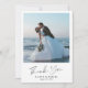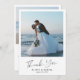 Minimalist trendy simple black and white hand-lettered script wedding thank you card personalized on both sides with your custom 2 photos, pre printed message, and signature.