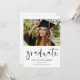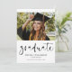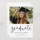 A modern graduation invitation featuring the word “graduate” on the front in stylish script calligraphy with your favorite photo, plus another senior photo on the back alongside your own custom text honoring the grad. This is the simple minimalist black and white version.