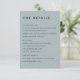 The Aesthetic: Provide your guests with essential information in a cool, sophisticated style with this modern slate enclosure card. This "information hub" utilizes a bold, architectural layout and our signature black Dongle typography to organize your wedding specifics into clean, sophisticated blocks. The muted slate background acts as a gallery-style canvas, ensuring your details are as beautiful as they are functional. Industrial Clarity & Design: This card is engineered for maximum organization. We’ve pre-set the information into three distinct sections: Accommodations, Reception, and Wedding Website. To maintain the "industrial-chic" hierarchy, we recommend entering your details in all caps for the first two sections; then, use lowercase for your wedding website to create a visual contrast that helps the URL stand out. The Branded Monogram: This fully customizable template features a sophisticated "L & G" couple's monogram on the back, serving as a cool, architectural signature for your suite. This designer touch ensures your stationery looks cohesive and professional from every angle. Personalization & Quality: Easily update each block while maintaining the perfectly balanced editorial grid. For a premium, non-reflective finish that enhances the cool tones of the design, I highly recommend our Matte paper stock—its heavy-weight, high-quality feel is the perfect match for the "Signature Palette" aesthetic. A Designer’s Pro-Tip: This enclosure card is designed to sit perfectly behind your invitation and RSVP card. By keeping your secondary details on this dedicated slate card, you allow your main invitation to remain a clean work of art while adding a professional layer of color to your suite.