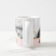 A mug with an elegant and modern marbled pattern. White, black and smoky gray marble with thin ribbons of faux-gold swirls throughout the pattern. A light pink gradient background beneath the marbled pattern.