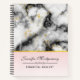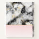 Spiral notebook with an elegant and modern marbled pattern. White, black and smoky gray marble with thin ribbons of faux-gold swirls throughout the pattern. A light pink gradient background beneath the marbled pattern.