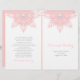 Modern and contemporary snowflake white and pink winter folded wedding ceremony and party program that features a white snowflake and an image of a jewel on pink background. This elegant and stylish wedding template design is completely customizable and personalized and it is perfect for a winter December Christmas wedding. You will have to fold it in half. Choose only this type of paper-value as it folds well. Some elements are courtesy of vectorportal.com.
