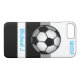 Trendy iPhone 6 case with a black, gray, white, and blue color scheme, a large illustrated soccer ball, and personalized with your name or custom text.